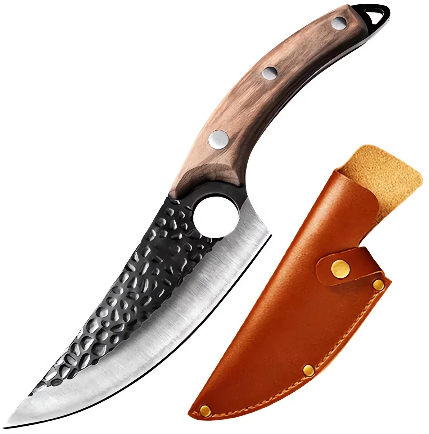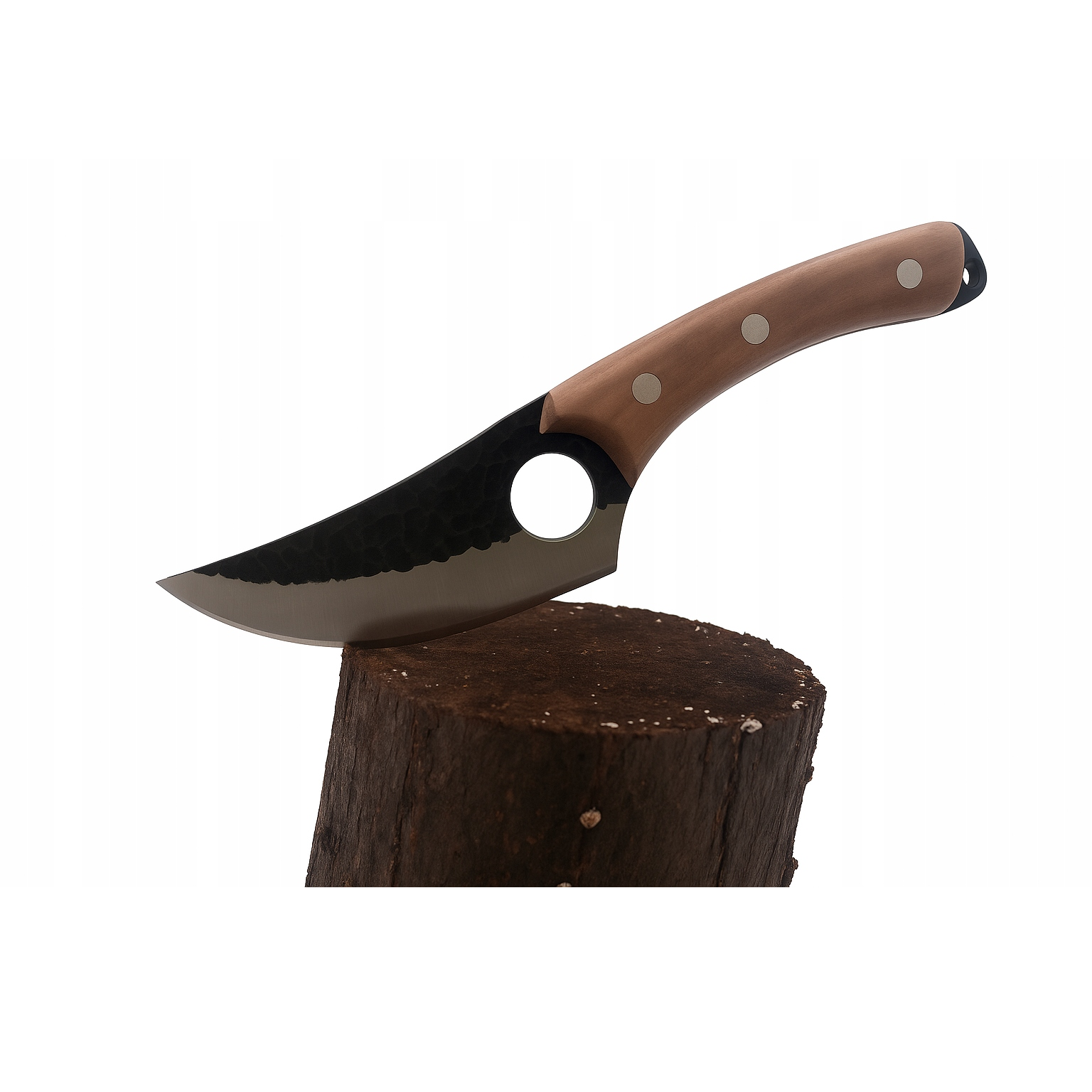 Ručně kovaný kuchyňský nůž (sekáček) o celkové délce 280 mm. Čepel délky 150 mm je z nerezové oceli. Praktický nástroj pro běžné kuchyňské úkony.