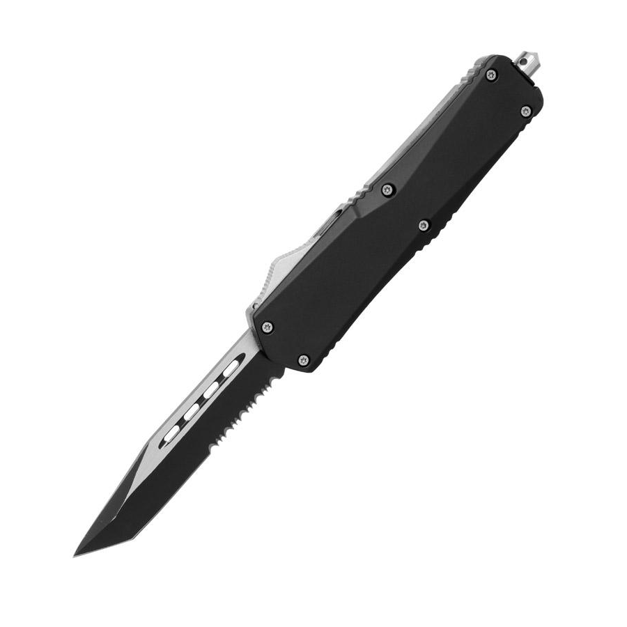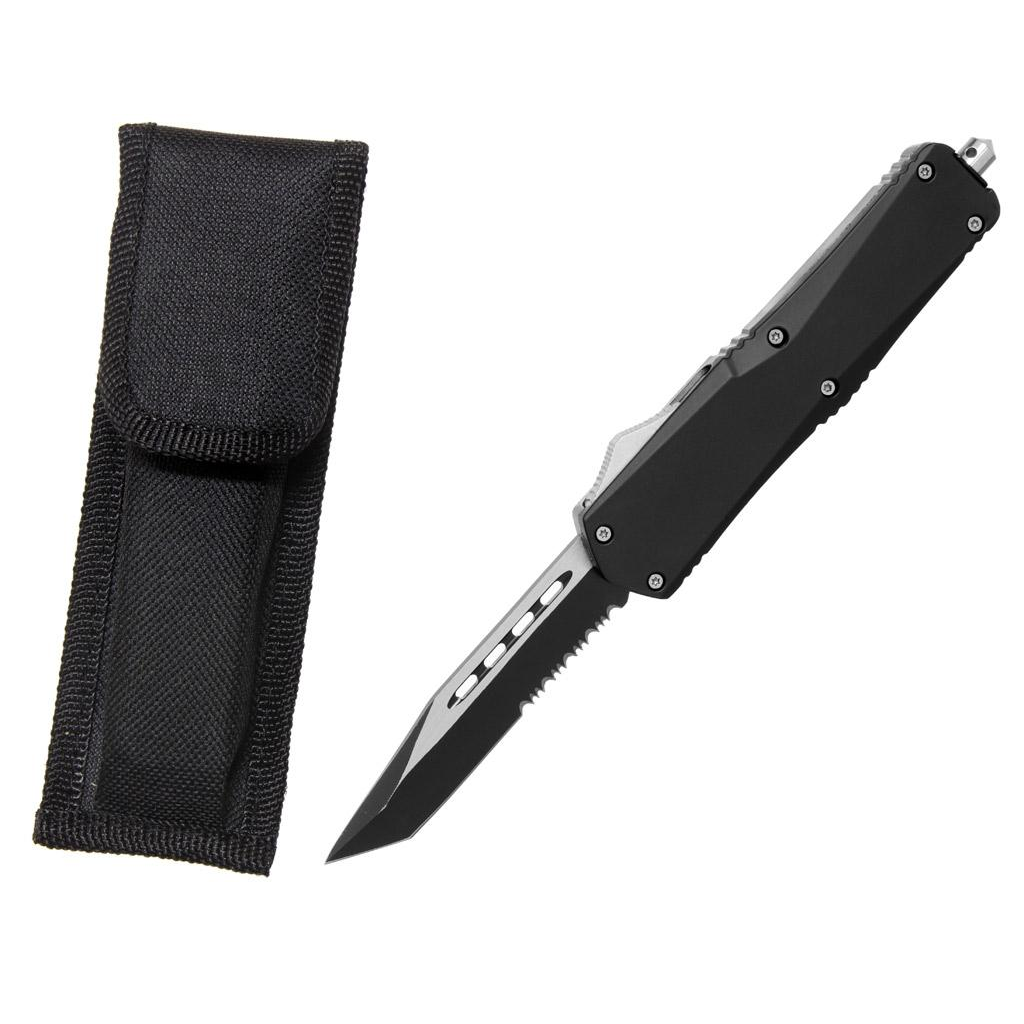 Moderní vystřelovací nůž s hladkou i částečně zubatou 90mm čepelí — kompaktní a pevná celokovová konstrukce, která pohodlně sedí v ruce díky oblým hranám a plochému profilu. Čepele se vysouvá z rukojeti dopředu jedním posuvným tlačítkem, rukojeť má „sametovou“ protiskluzovou úpravu a na konci je úderový hrot.